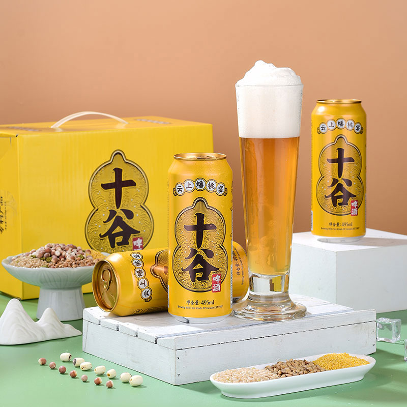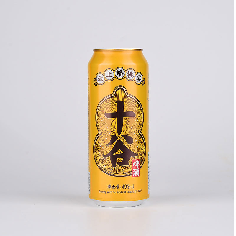 外观:明黄色罐体勾勒着色彩典雅的葫芦,寓意包容和福禄。尊贵典雅的外观蕴藏着神秘东方文化,葫芦边缘的金线象征着古代的丝绸之路,不同的文化底蕴在此融合,如同十谷啤酒的原料一般,十种谷物相互糅合。