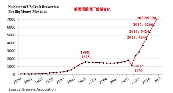 截止到2020年底美国精酿酒厂的数量已达9000家以上。