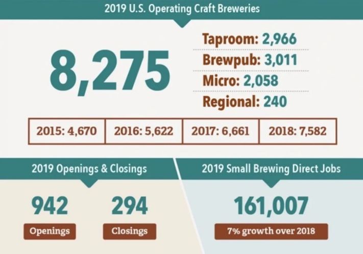 美国作为世界啤酒风向标之一,美国啤酒市场变化对于全球行业具有很好的借鉴作用。近10年来,美国精酿酒厂数持续上升,2019年达到8275家,包括2058家微型酒厂,3011家自酿啤酒吧,2966家taproom酒吧,以及240家区域性精酿啤酒厂,全美新开酒厂942家。