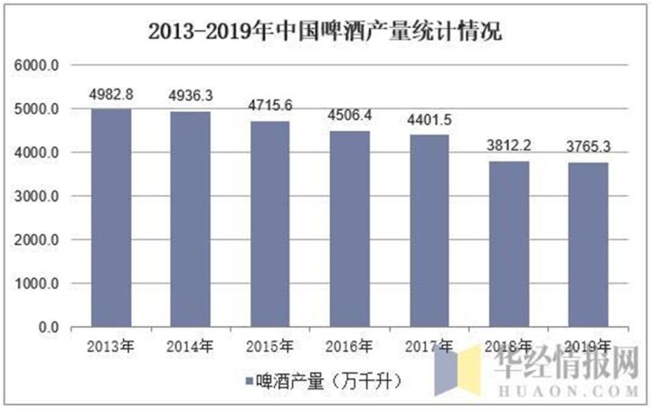 2019年国内啤酒产量下滑至3765.3万千升,人均啤酒消费量降低到28.9升。