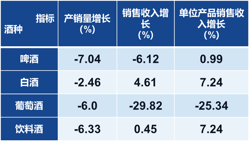 Ø 白酒下降2.46%,葡萄酒下降6.00%。